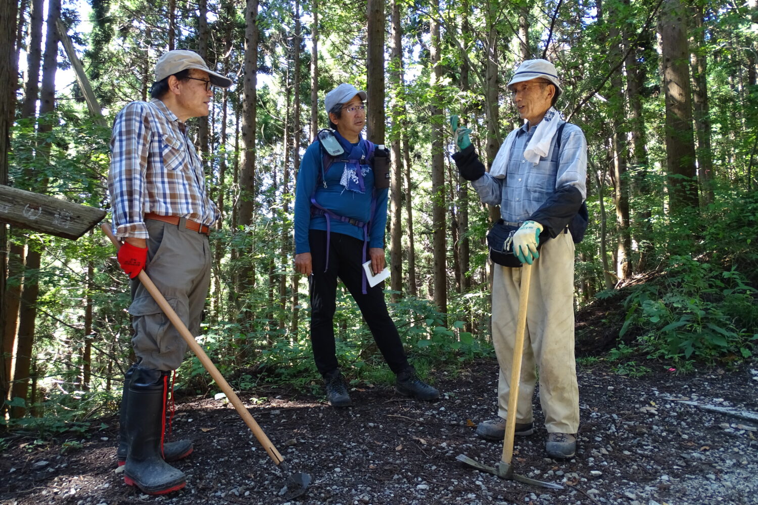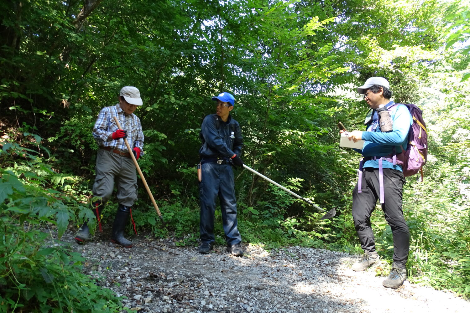 この日に集まったのは約20人。まずは会長さんの挨拶と注意事項、整備内容の説明があり、それぞれが道具を手にしてスタート。「みちのくトレイルクラブ」の方も参加して、整備についての指導を行なっていました。