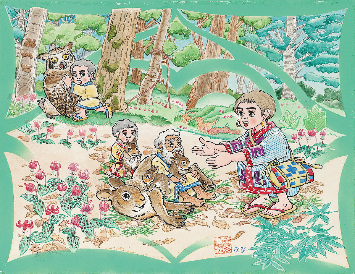 横山 孝雄 画 アイヌをテーマにした原画 3 中央に大きな兎、小さな兎を抱える白髪の老人、その隣には女の子がリスを抱いています。奥の林にはフクロウを抑えるように少年がいて、画面右側には大人の人間の女性がいます。全体的に森のなかの出来事に見えます。全体を覆うようにアイヌらしい文様が切り抜きのように囲んでいます。落款が画面中央よりやや右の下段に確認できます。