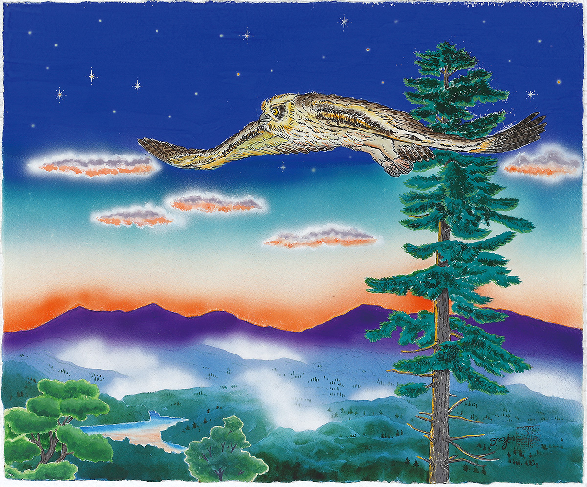夕景、上空には星が見え始めているなか、フクロウが大きな翼を広げ雄大に滑空している構図です。