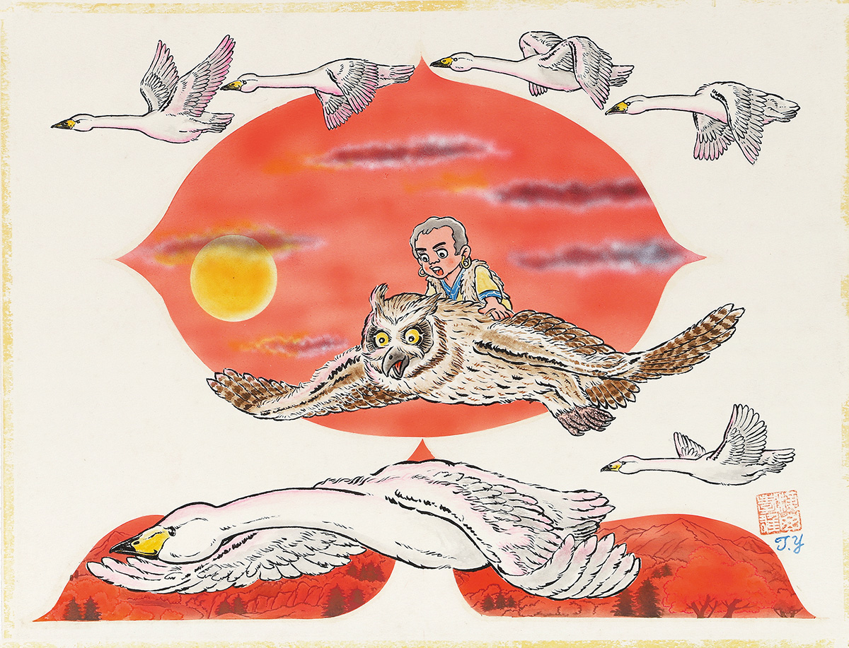 夕日を背景に6羽の白鳥のなかにフクロウの背に乗った少年が描かれています。右下には横山孝雄の落款が確認できます。