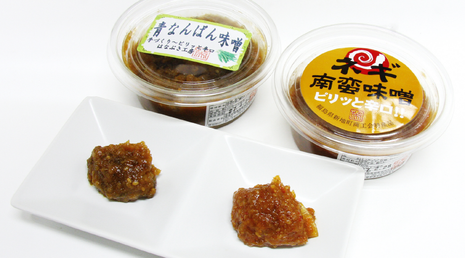 新地産青南蛮を使った辛口の「青南蛮味噌」、新地産ネギを炒めて甘みを引き出し、赤味噌を加えてじっくり練り込んだ「ネギ南蛮味噌」。酒のつまみや炊きたてのご飯やおにぎり、豆腐などによく合います。