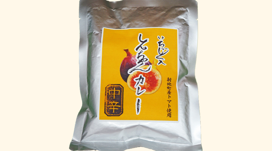 新地町産いちじくとトマトを使用。独特のプチッとした食感とピリッとしたスパイスが効いたオリジナルの中辛のレトルトカレー。