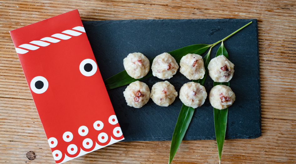 新地、相馬で水揚げされた新鮮なタコを100%使用。地域に多幸(タコ)をもたらす商品として開発し、丁寧に手作りしています。魚介のうま味と柔らかさ、タコの食感が口いっぱいに広がります。